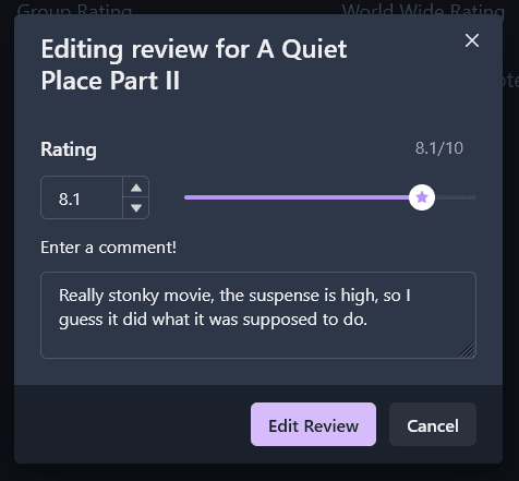 Another big UX improvement is related to editing reviews, previously there wasn't an 'editing' state while writing reviews, submitting a review would overwrite the previous. I changed this so the review modal would pre-populate with the old review. Now you don't have to re-type out a whole review just because you made a typo!